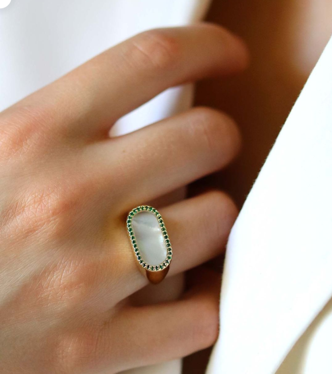 Nacre blanche entourée de cristal de zirconium vert