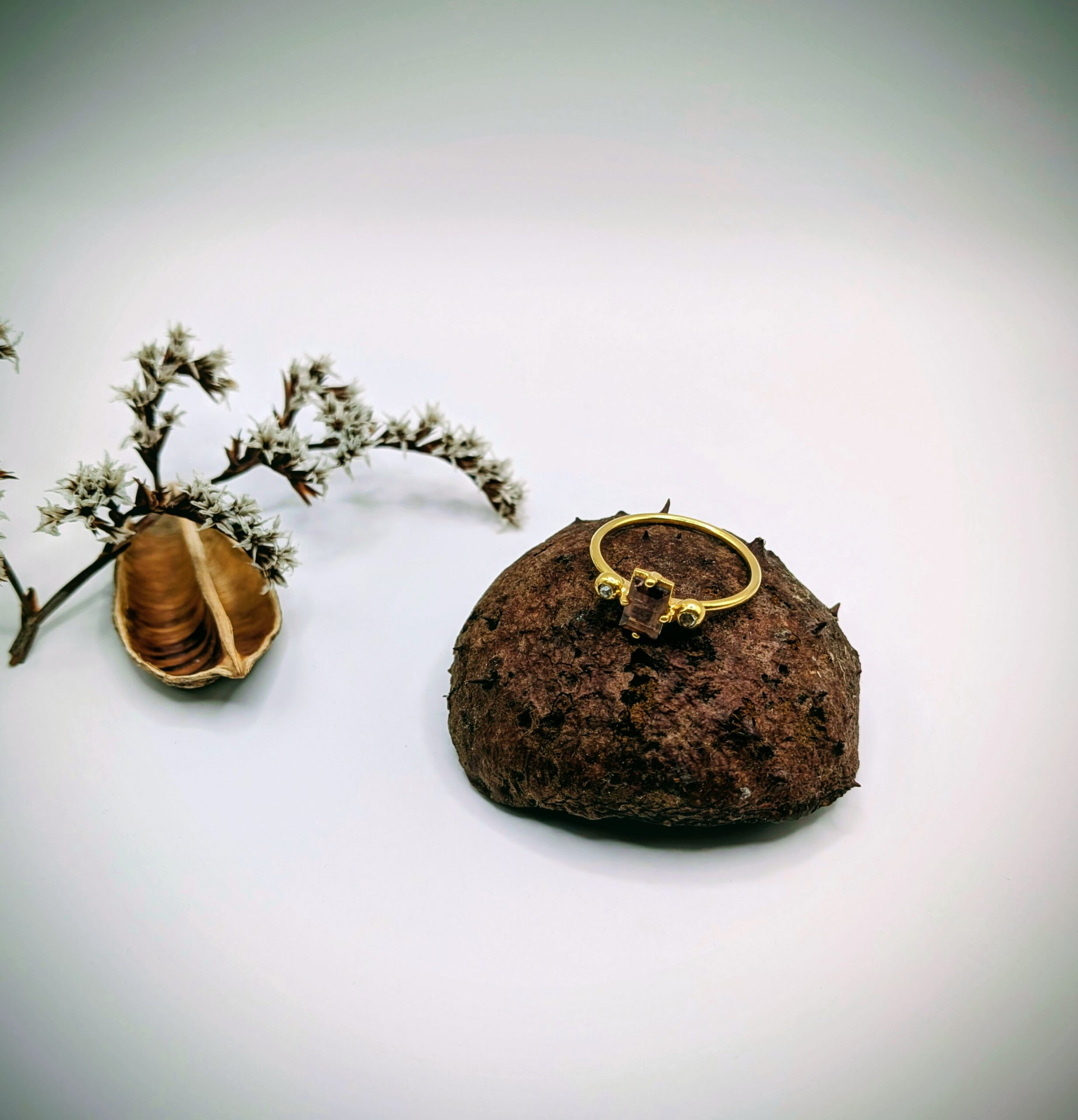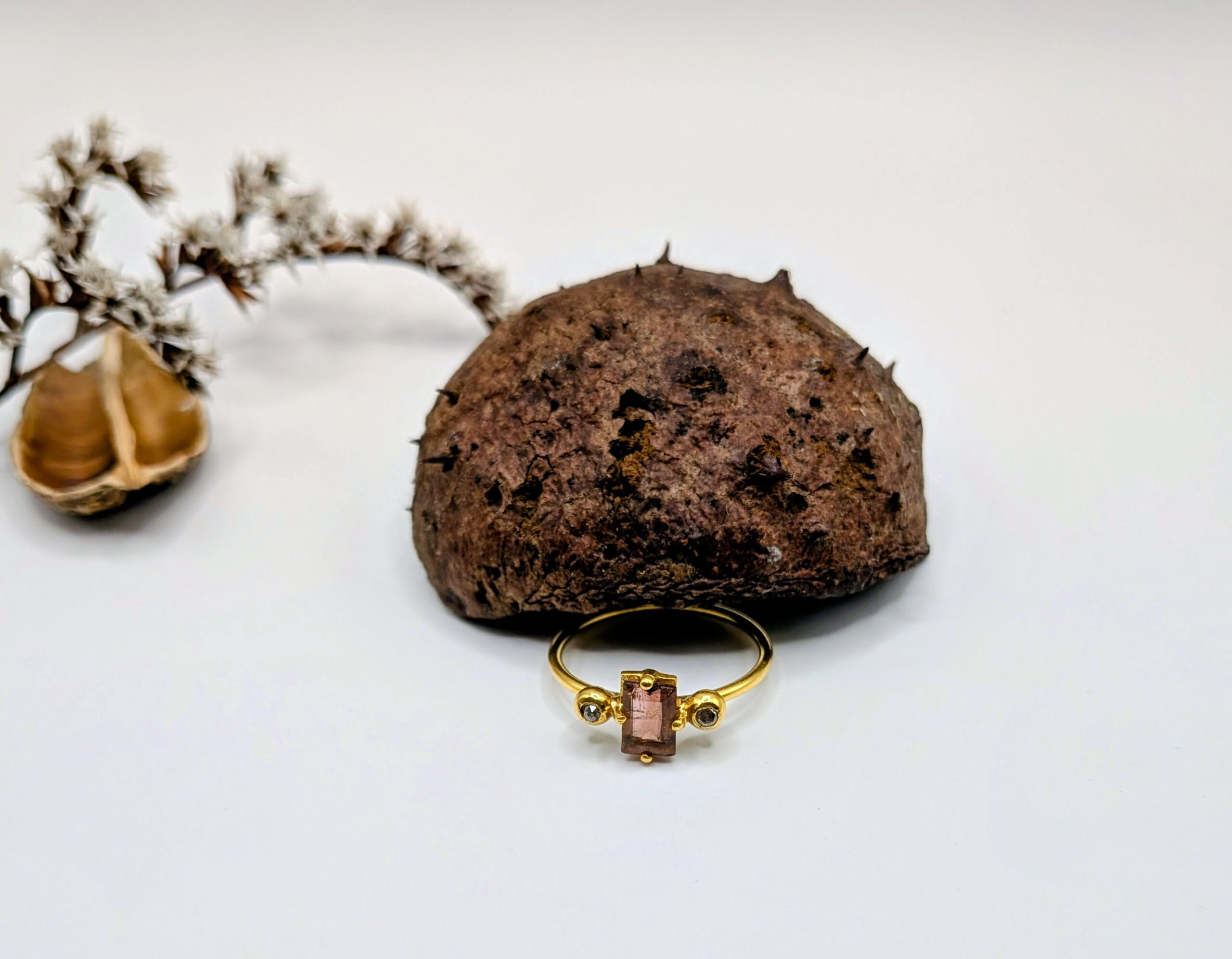 Tourmaline rose au centre, sertie de 2 diamants boules