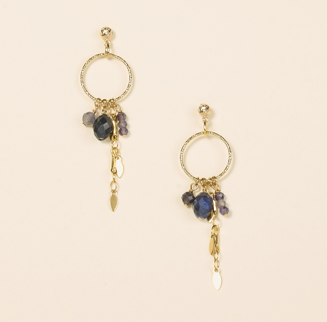 Boucles d’oreilles pendantes et circulaires en iolite et agate bleue et or fin 2 microns 24 carats