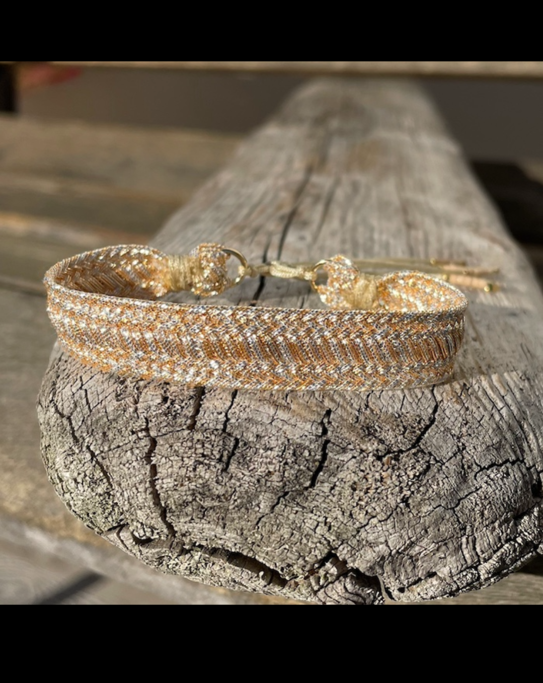 Bracelet en fils de soie dorés et argentés aux nuances colorées