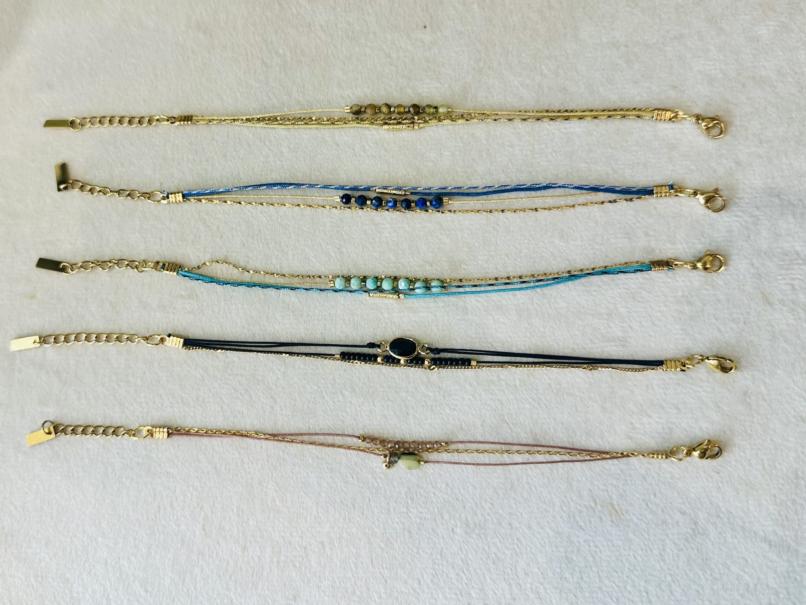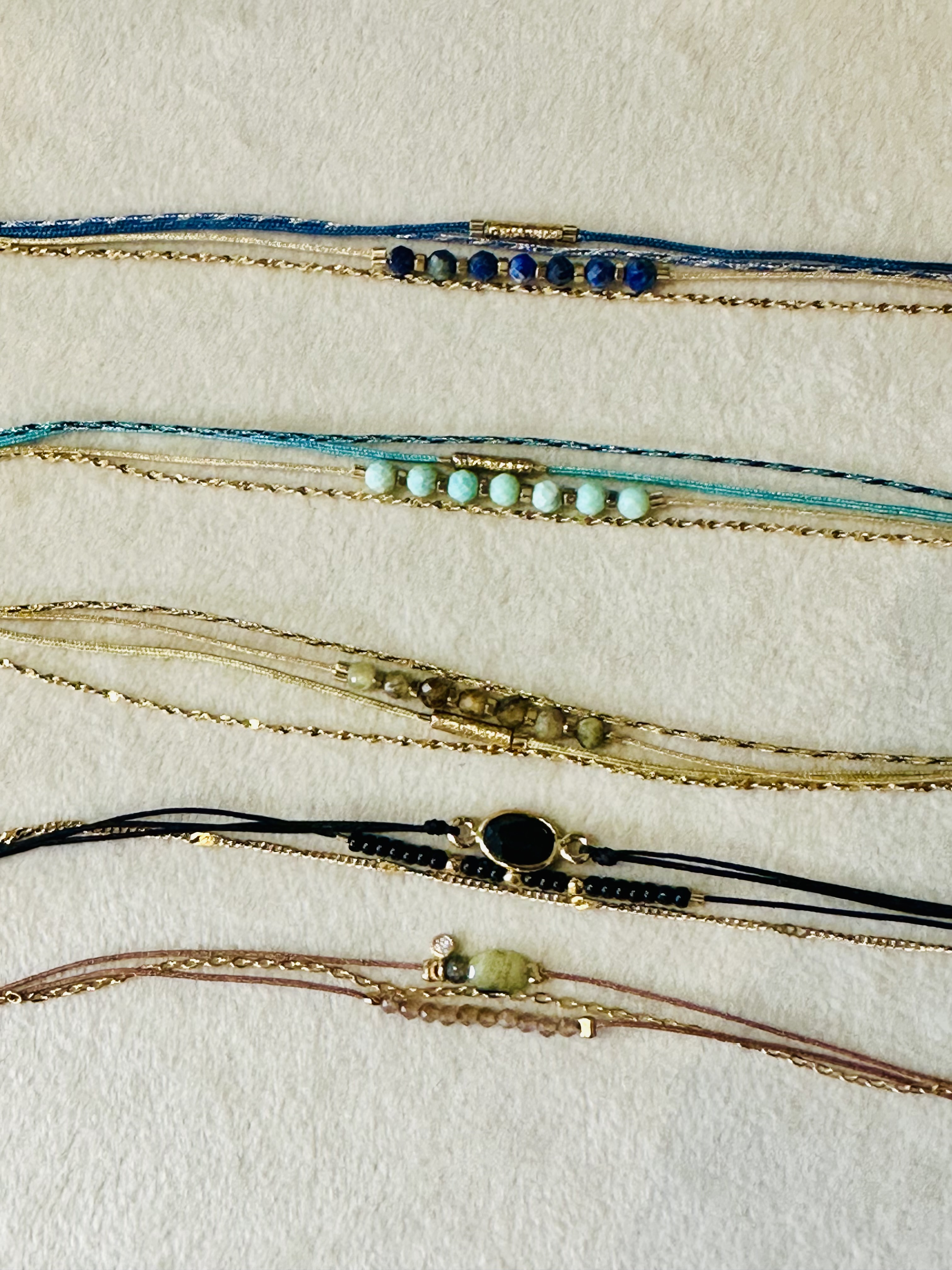Une jolie composition à poser sur le poignet. Un assortiment de cordons, de pierres, et une fine chaîne dorée 2 microns.