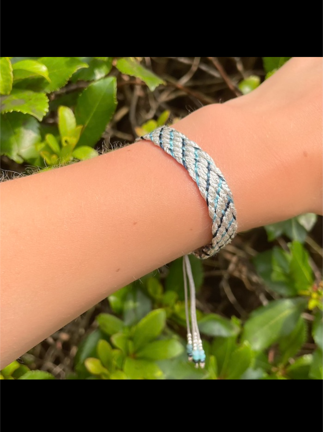Bracelet en fils de soie dorés et argentés et nuancés de bleus