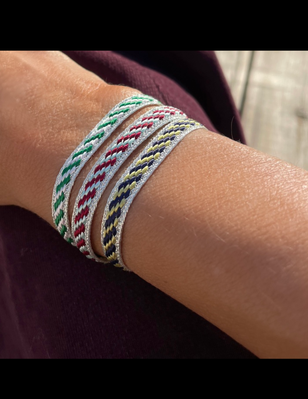 Bijou délicat tissé avec des teintes vertes, dorés et argentés. Se porte seul ou en accumulation 💕