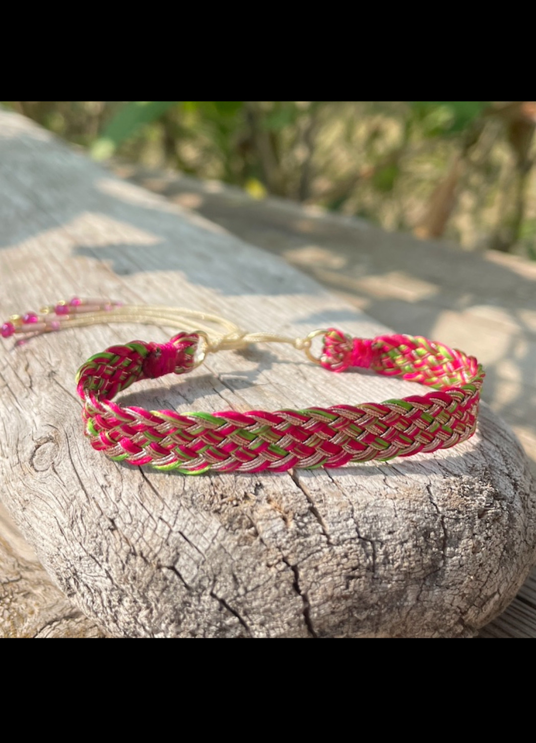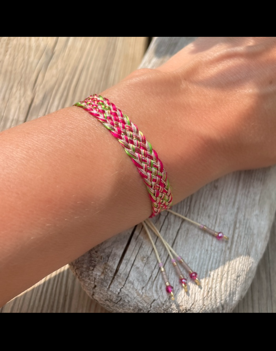 Le bracelet est ajustable grâce aux cordons coulissants et se glisse facilement autour du poignet.