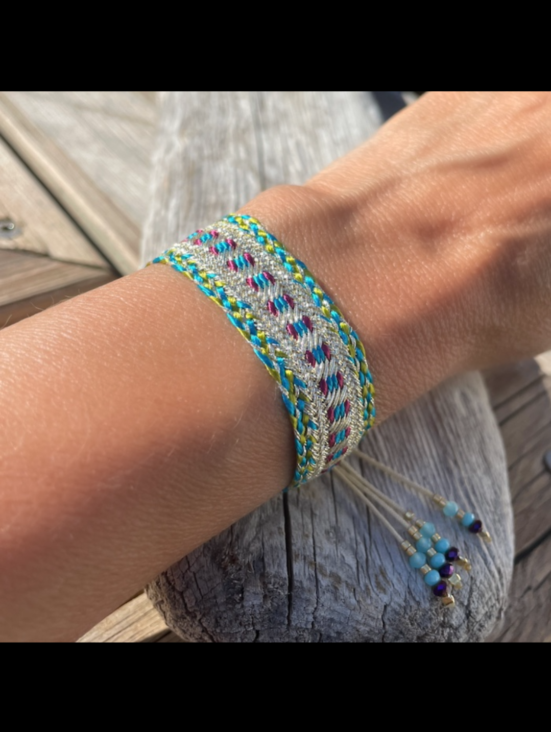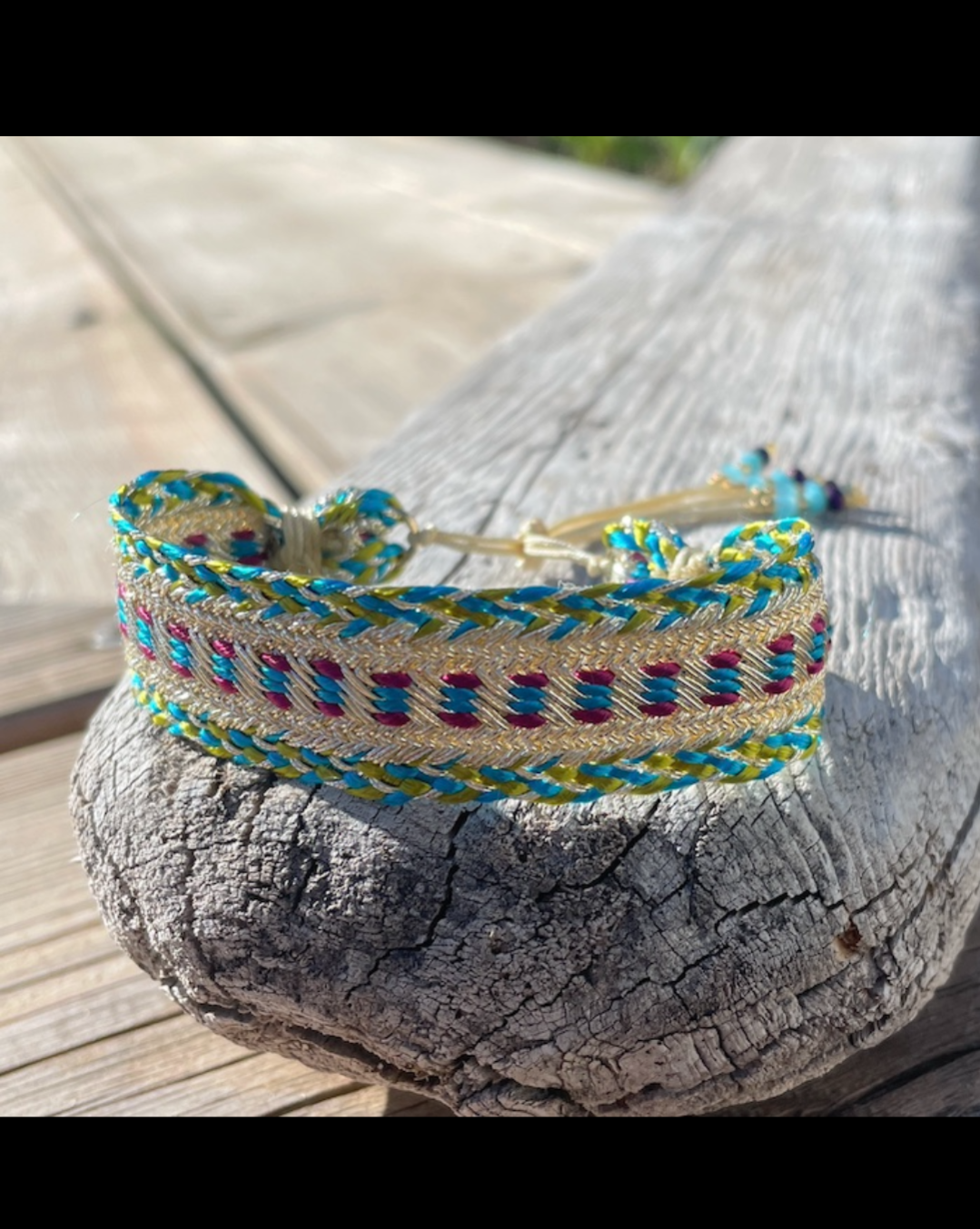 Bracelet en fils de soie dorés et argentés aux nuances multicolores