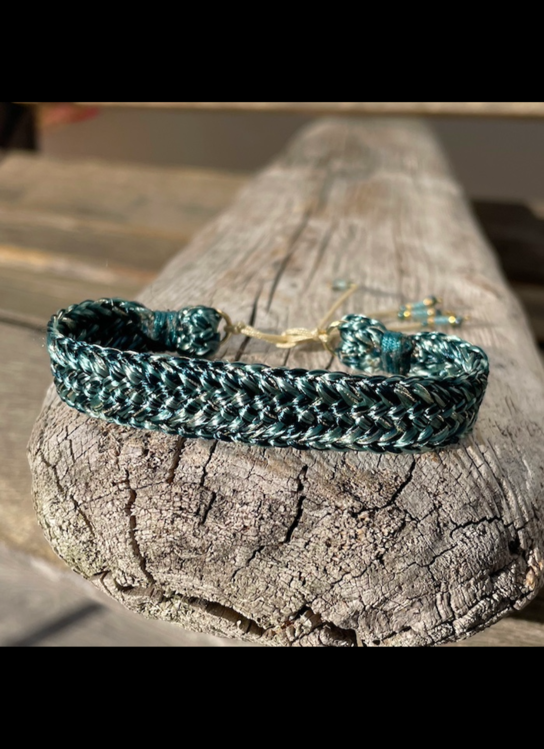 Bracelet en fils de soie dorés et argentés aux nuances colorées