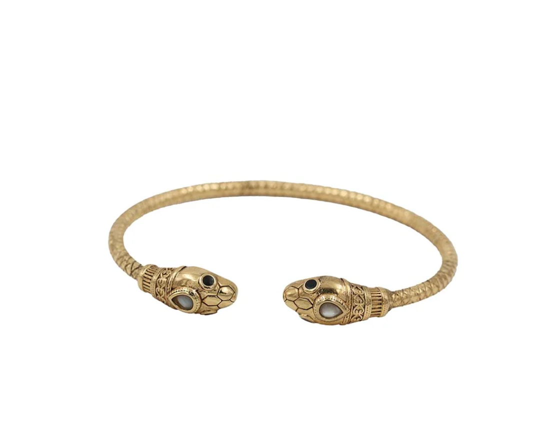 Bracelet jonc serpent double têtes et pierres naturelles de nacre blanche