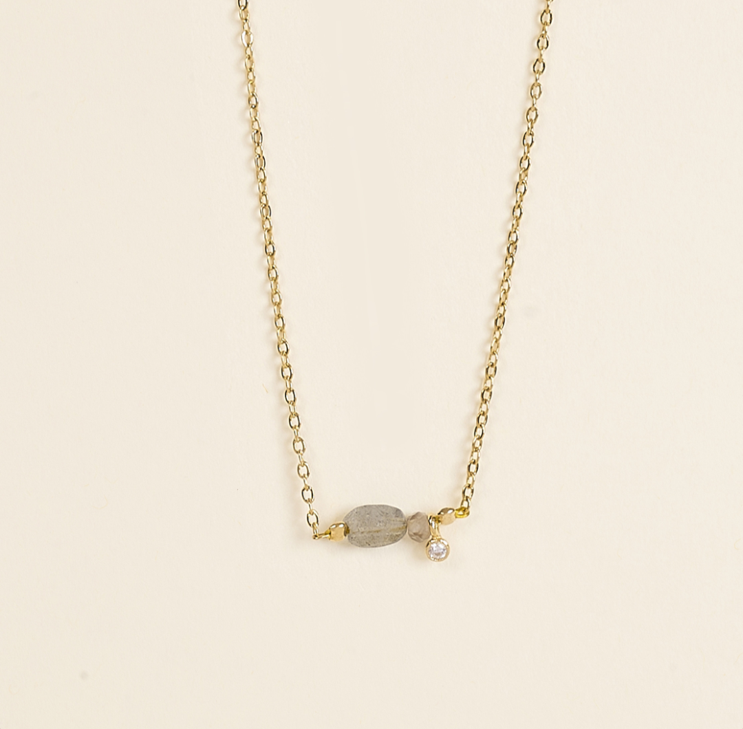 Collier se composant d’une perle ovale facettée en labradorite grise associée à un oxyde de zirconium serti clos