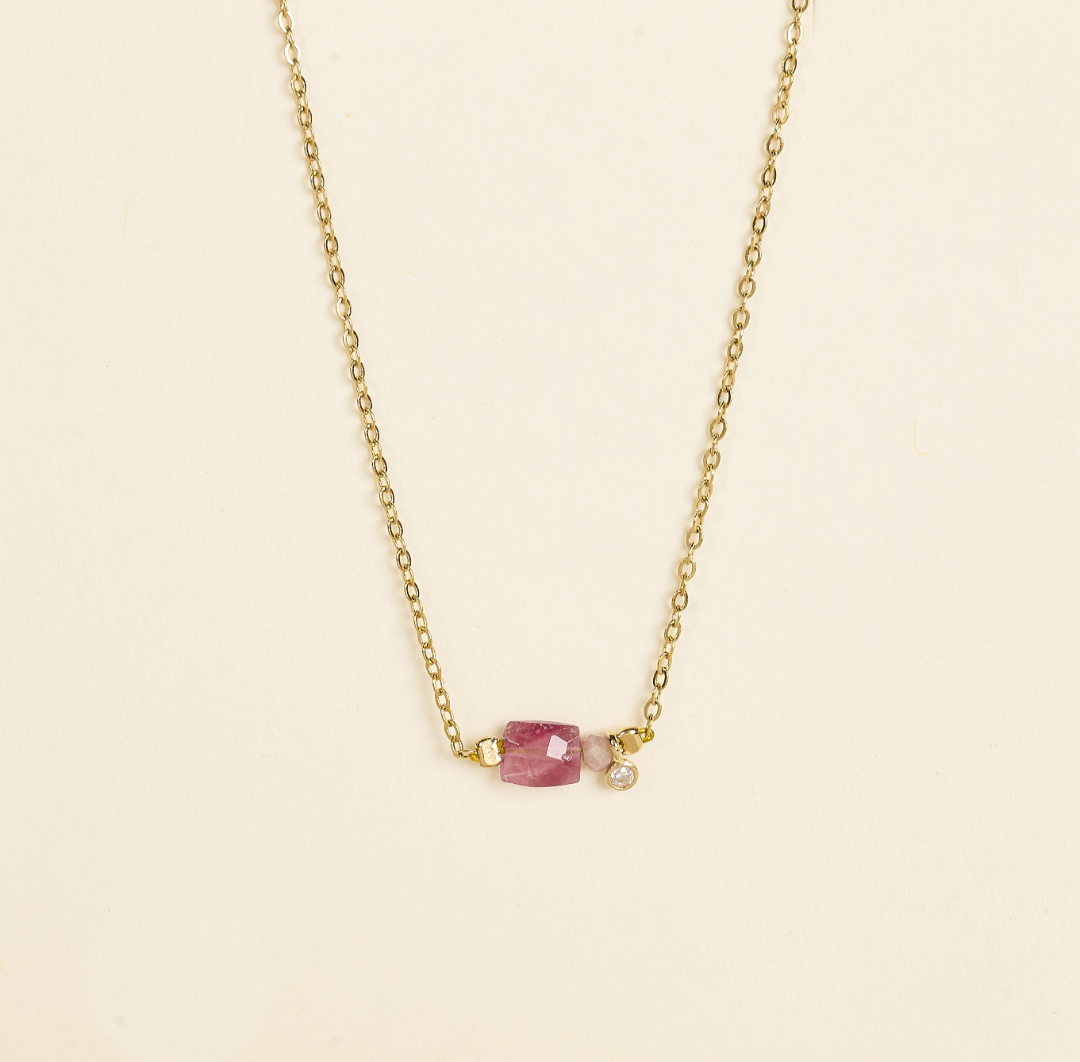 Collier se composant d’une perle ovale facettée en tourmaline rose associée à un oxyde de zirconium serti clos