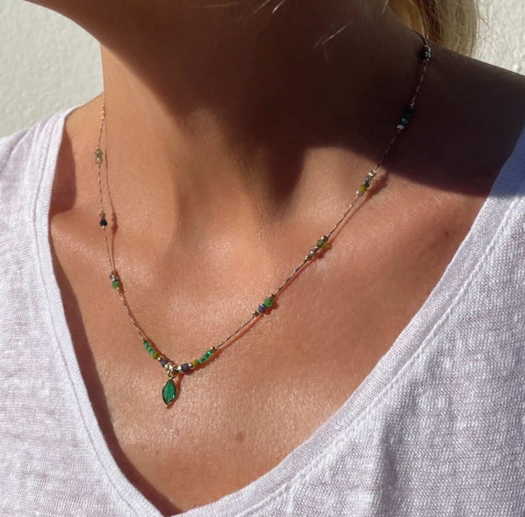 Ras le cou ou collier agrémenté d’une agate verte sertie en argent 925 plaquée or