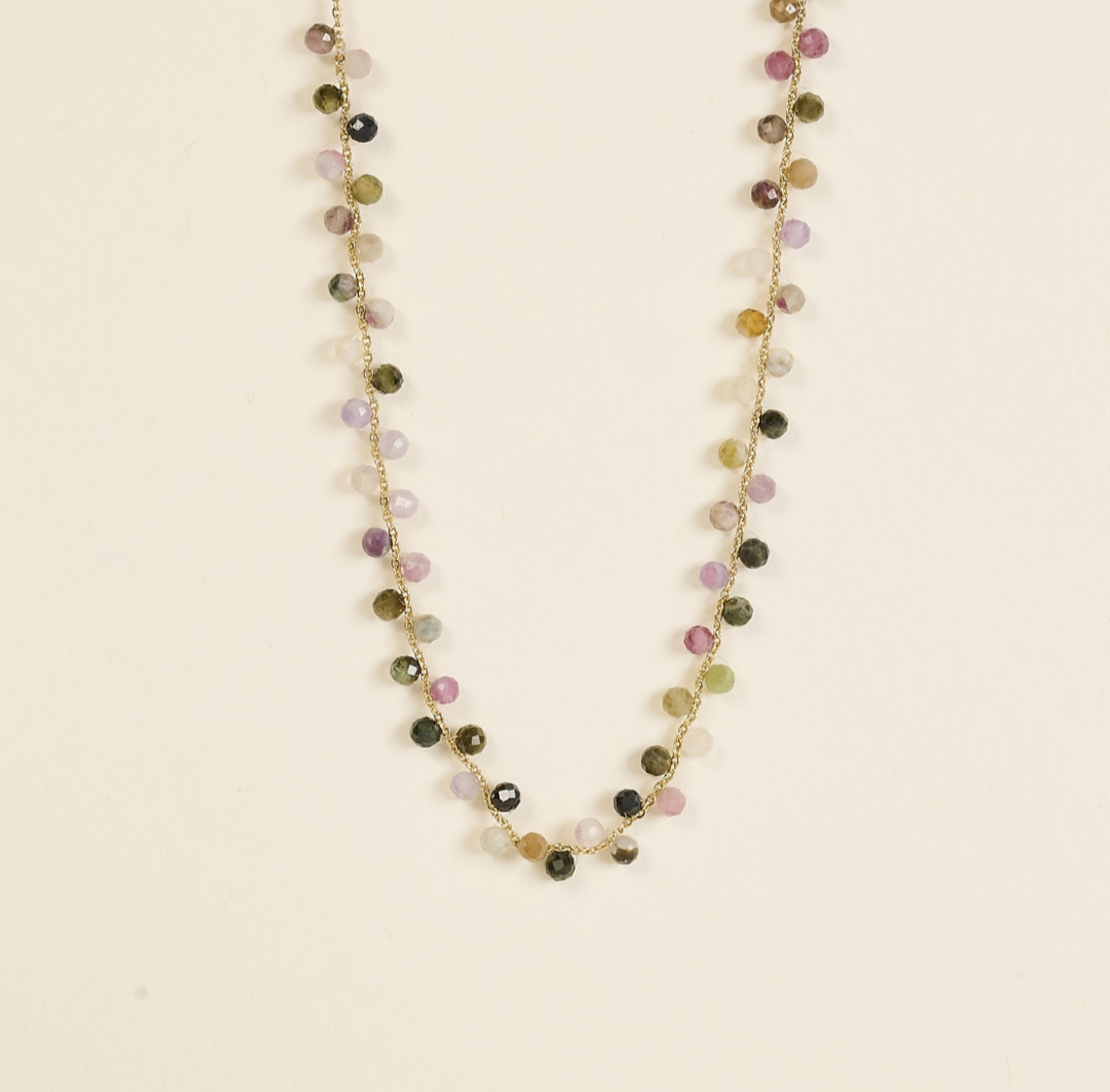 Collier en perles de Tourmaline multicolore sur chaîne fine en laiton doré à l’or fin 2 microns 24 carats