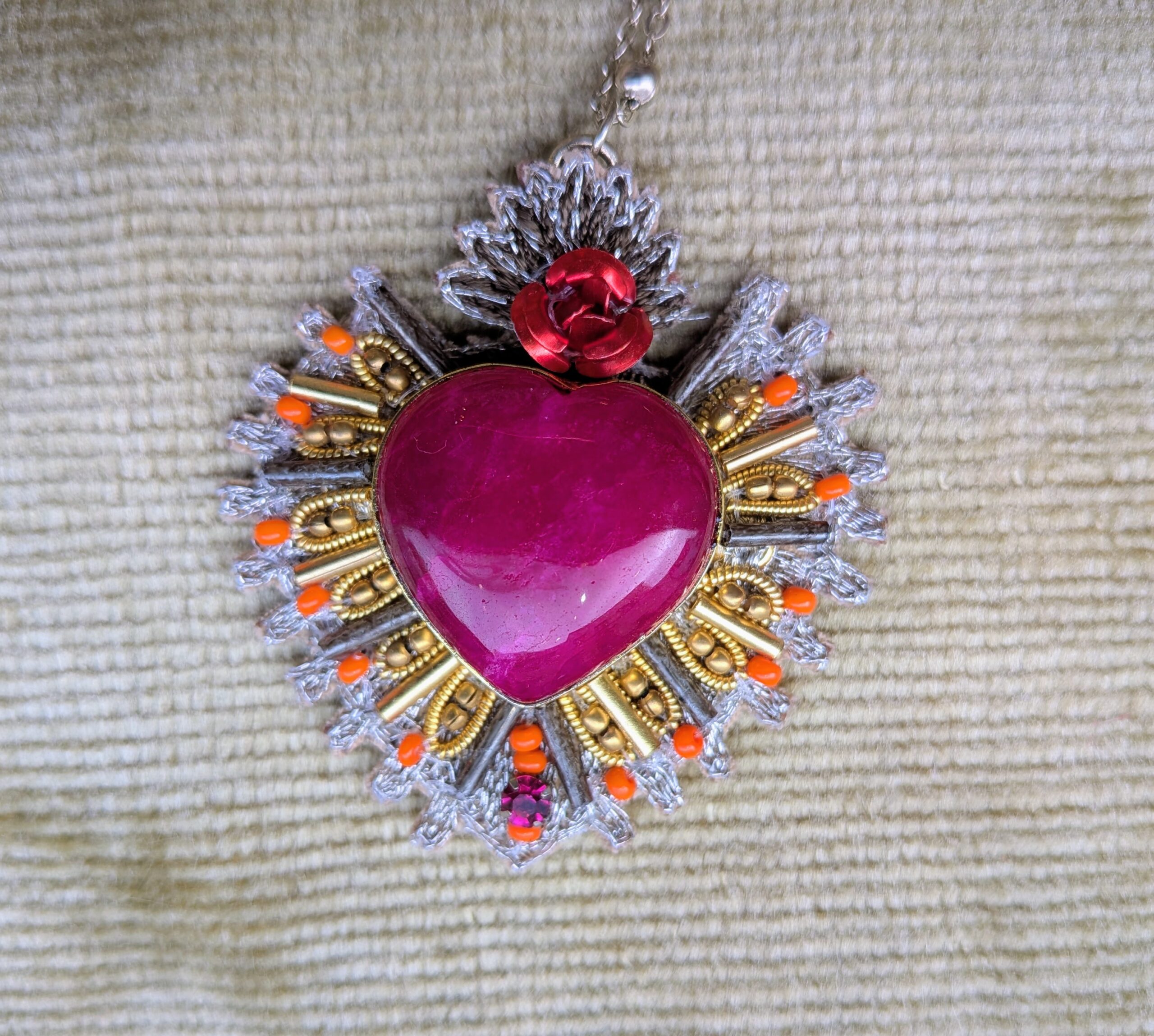Collier coeur ex voto en broderie et pierre naturelle quartz Cherry