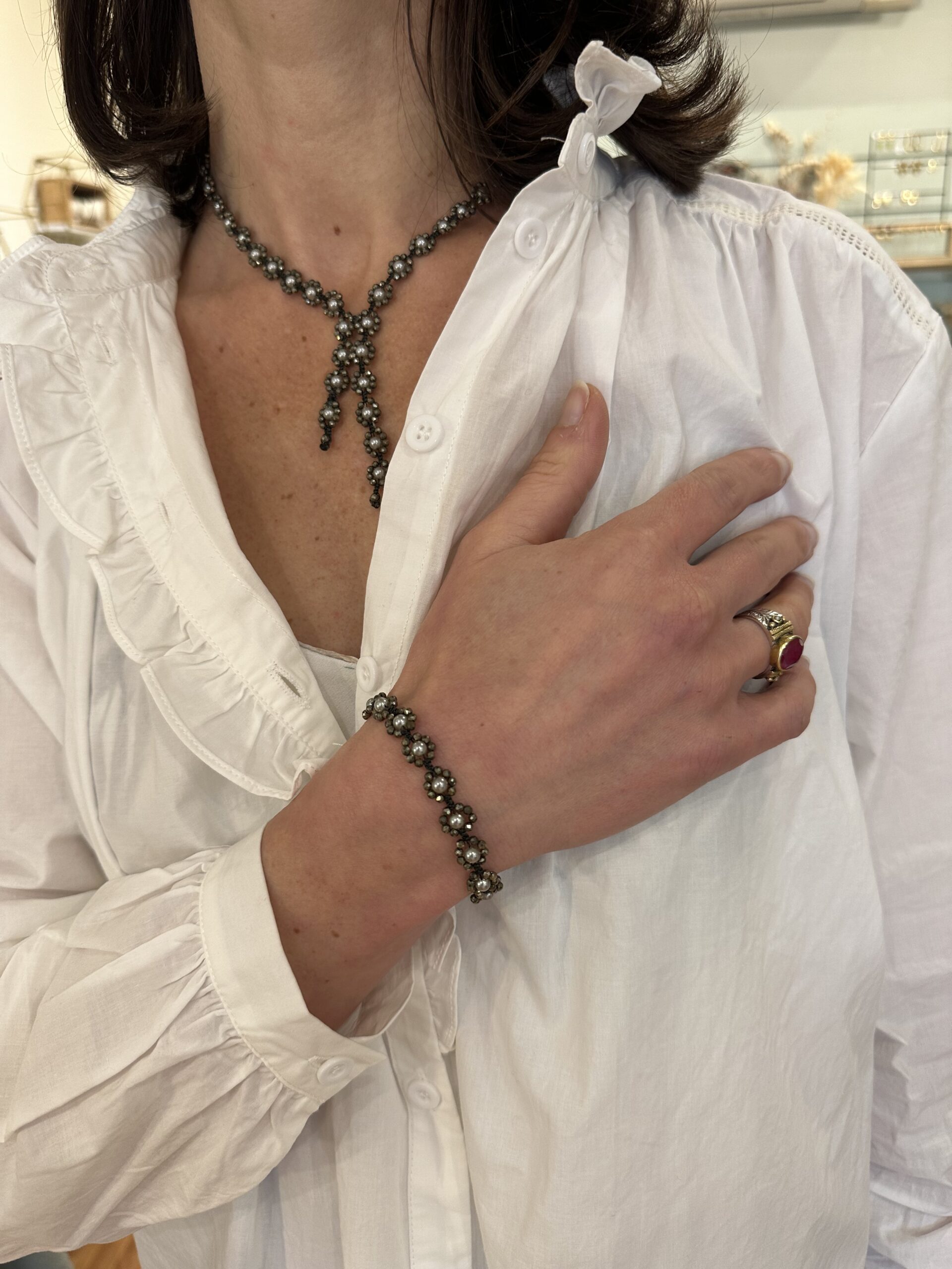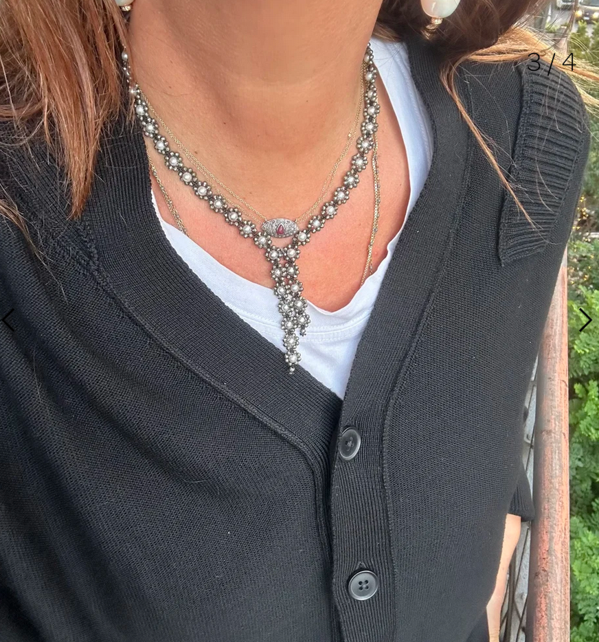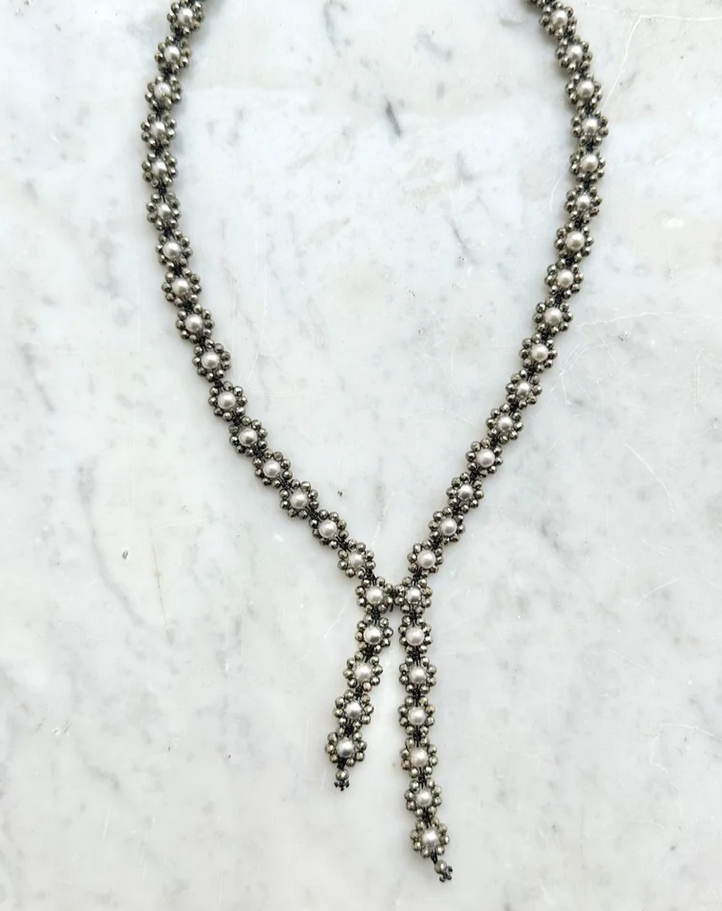 Collier de créateur italien en perles de culture grises et Pyrite, le tout crocheté en macramé