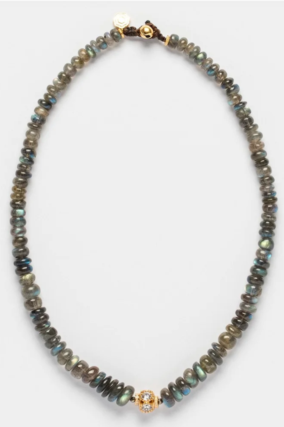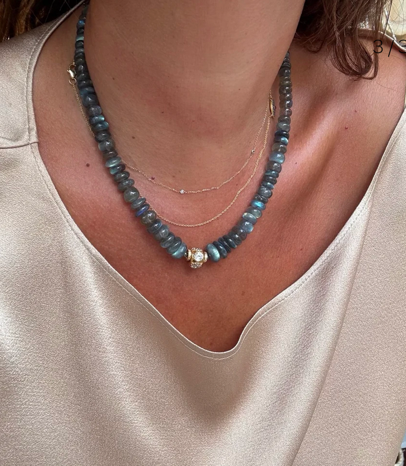 Ce collier est en Labradorite, pyrite, zircons et médaillon en argent plaqué or et gros zircons.