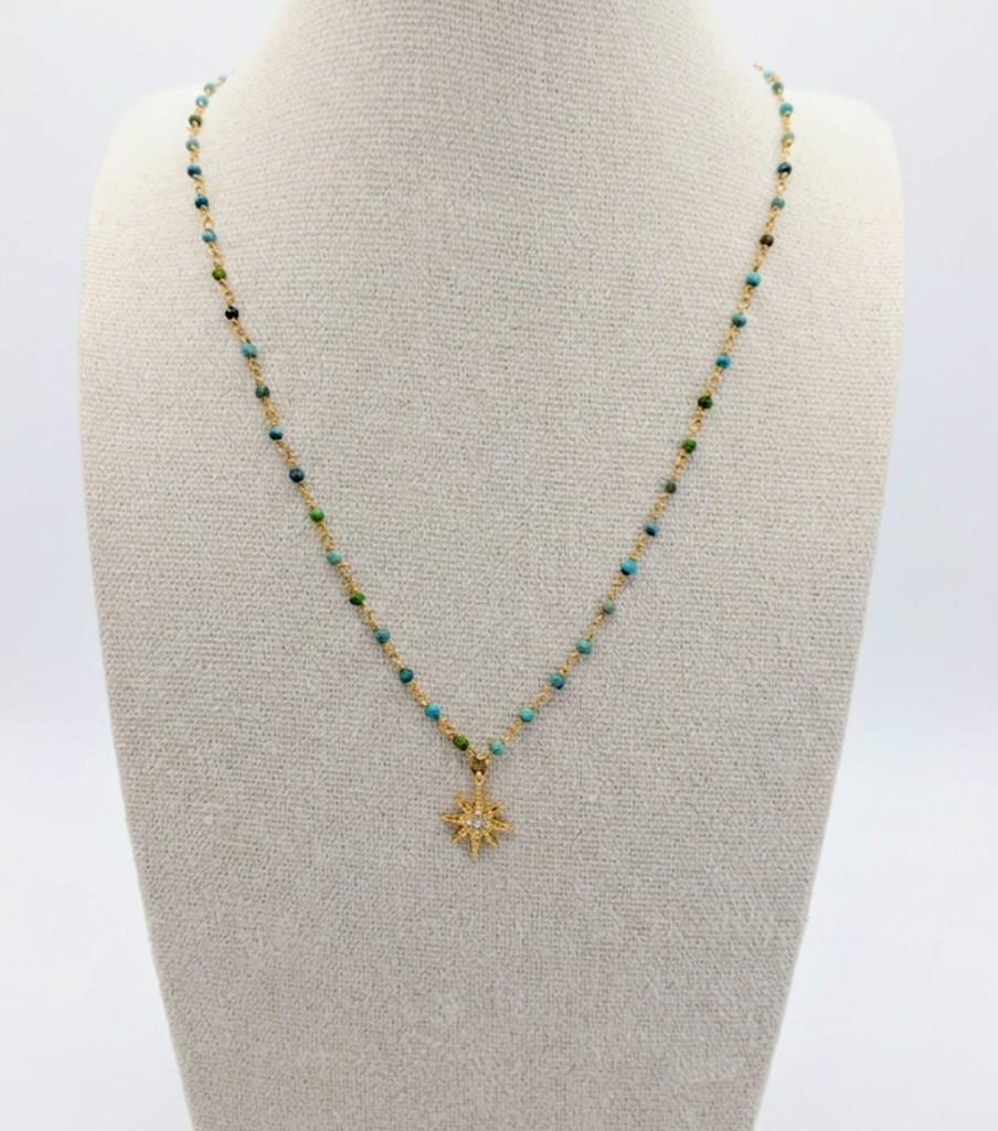 Collier finement assemblé en perles de turquoise, terminée par une jolie étoile qui scintille d’oxydes.