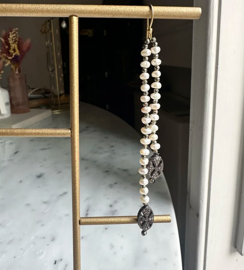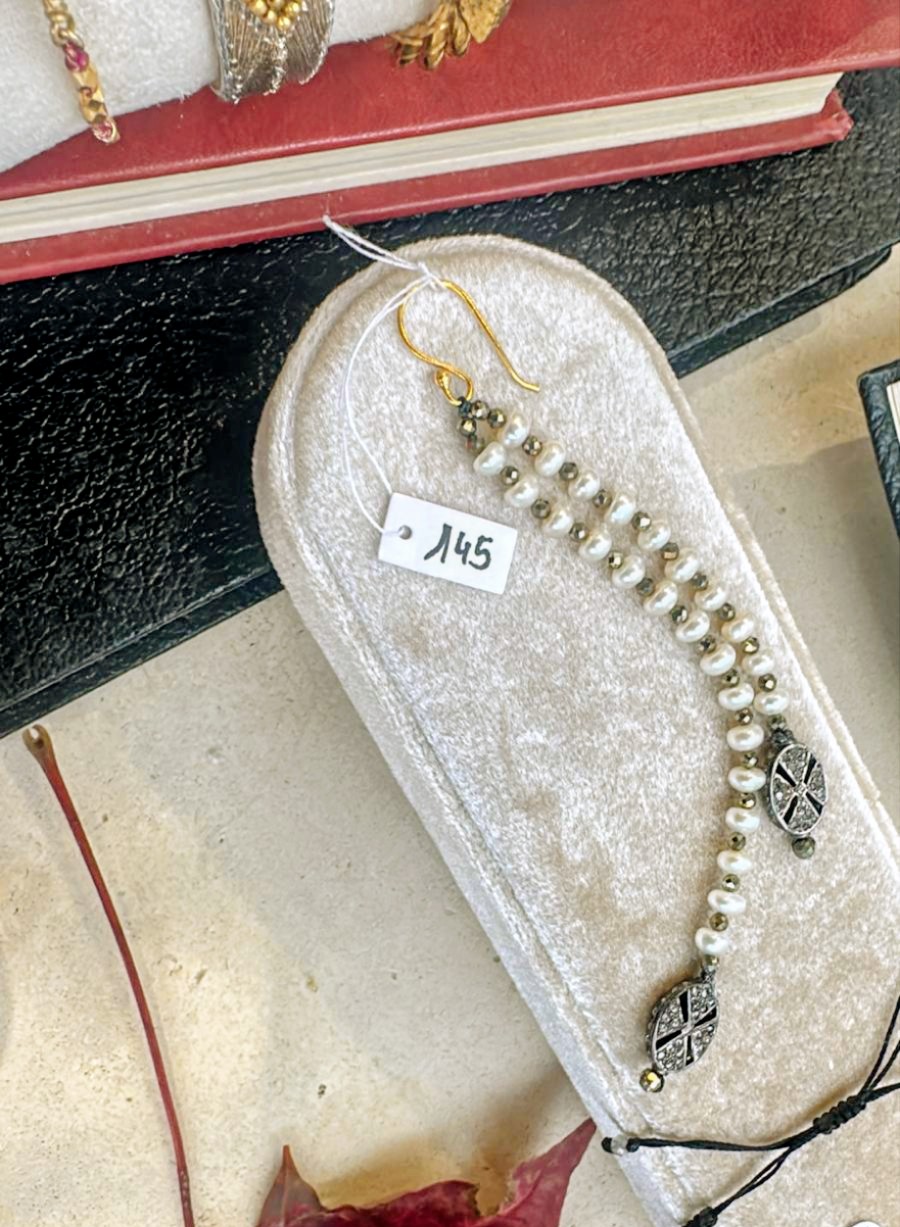 Monoboucle en perles d’eau douce et Pyrite, extrémités en diamants et argent rhodié