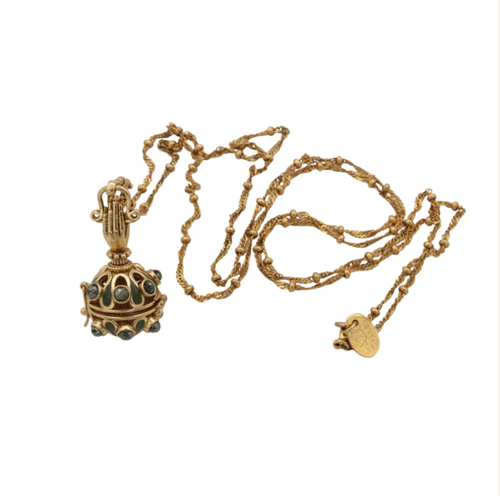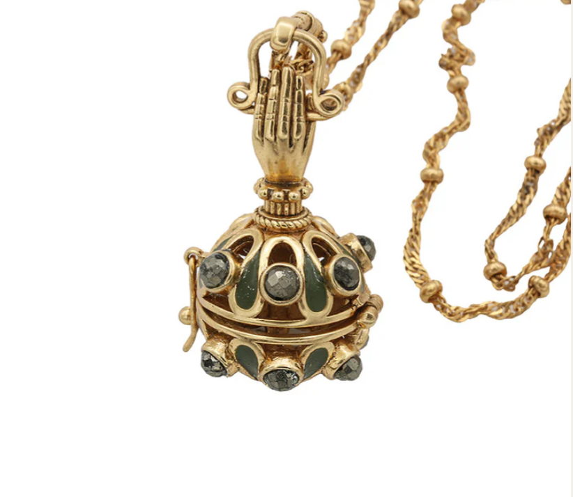 Sautoir avec chaine alternée maille boule de 72 cm, un pendentif en forme de boule ajourée, surmontée d’émail et de pyrite.